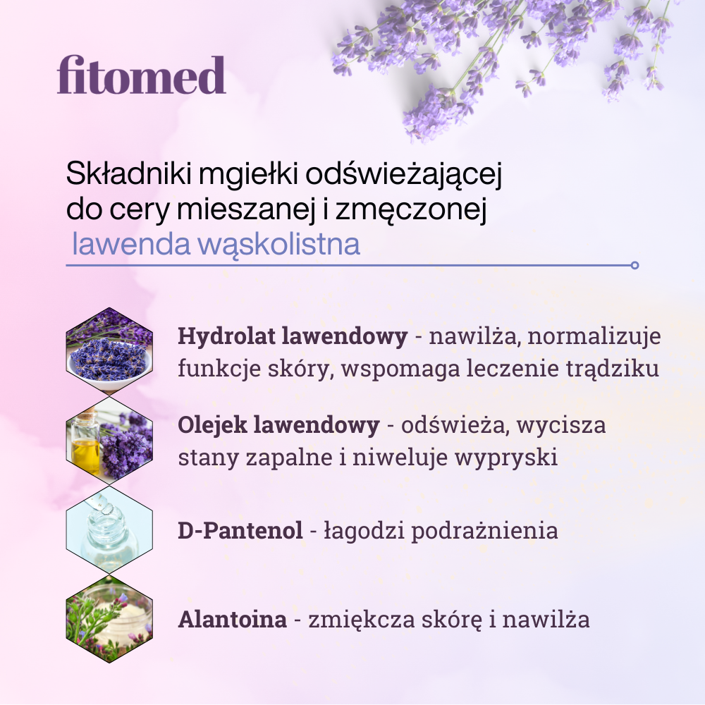- Odświeża i odżywia cerę mieszaną i dojrzałą, normalną. Mgiełka z olejkiem lawendowym o naturalnym i świeżym zapachu subtelnie odświeża cerę.