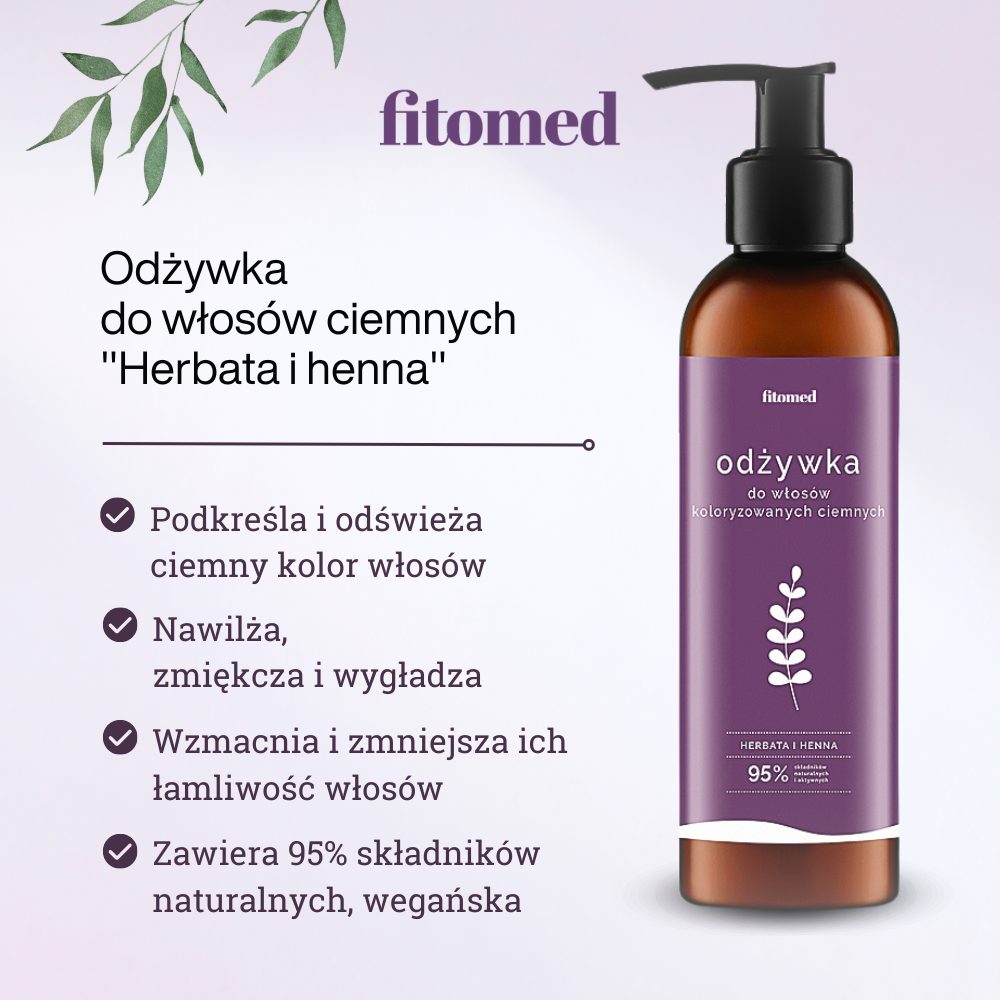 Sposób użycia: niewielką ilość odżywki nanieś na mokre, lecz osuszone ręcznikiem włosy, po kilku minutach spłucz ciepłą wodą. Dla uzyskania lepszego efektu pielęgnacyjnego polecamy stosowanie szamponu do włosów ciemnych Fitomed.
