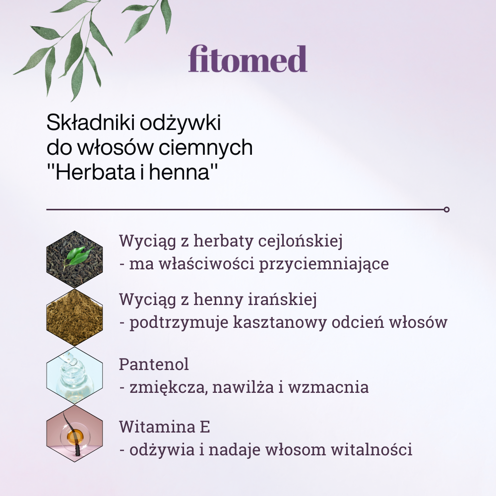 Odżywka do włosów koloryzowanych ciemnych „Herbata i Henna” (200 g) powstała na bazie ekstraktów ziołowych: z liści herbaty cejlońskiej i henny irańskiej. Formuła odżywki opiera się również na składnikach kondycjonujących oraz witaminach. Włosy zachowują na dłużej naturalny kolor lub wybrany kasztanowy, czarnej wiśni lub mahoniu.