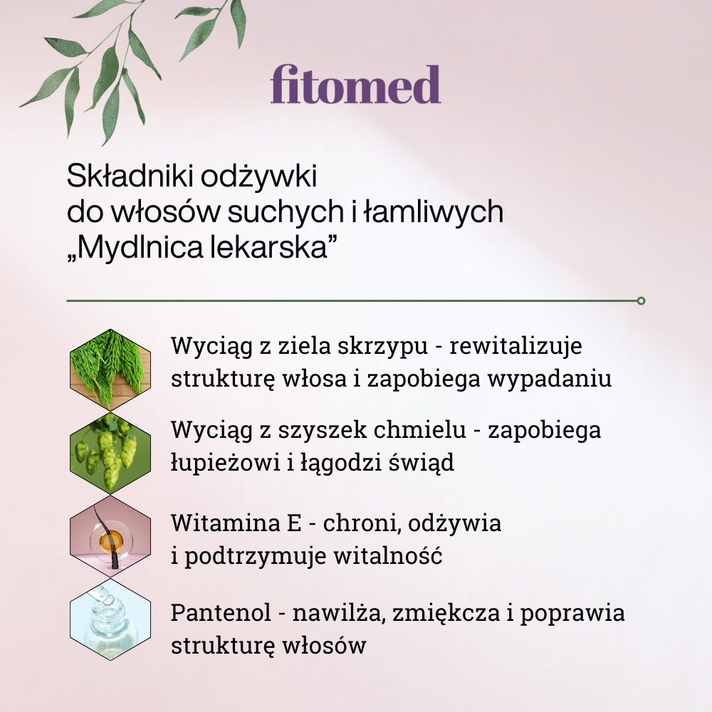 - Wzmocnienie struktury włosa. Dzięki składnikom aktywnym, takim jak wyciągi z ziela skrzypu i chmielu, odżywka zamyka łuski włosowe oraz zapobiega przenikaniu zanieczyszczeń atmosferycznych do włosa.