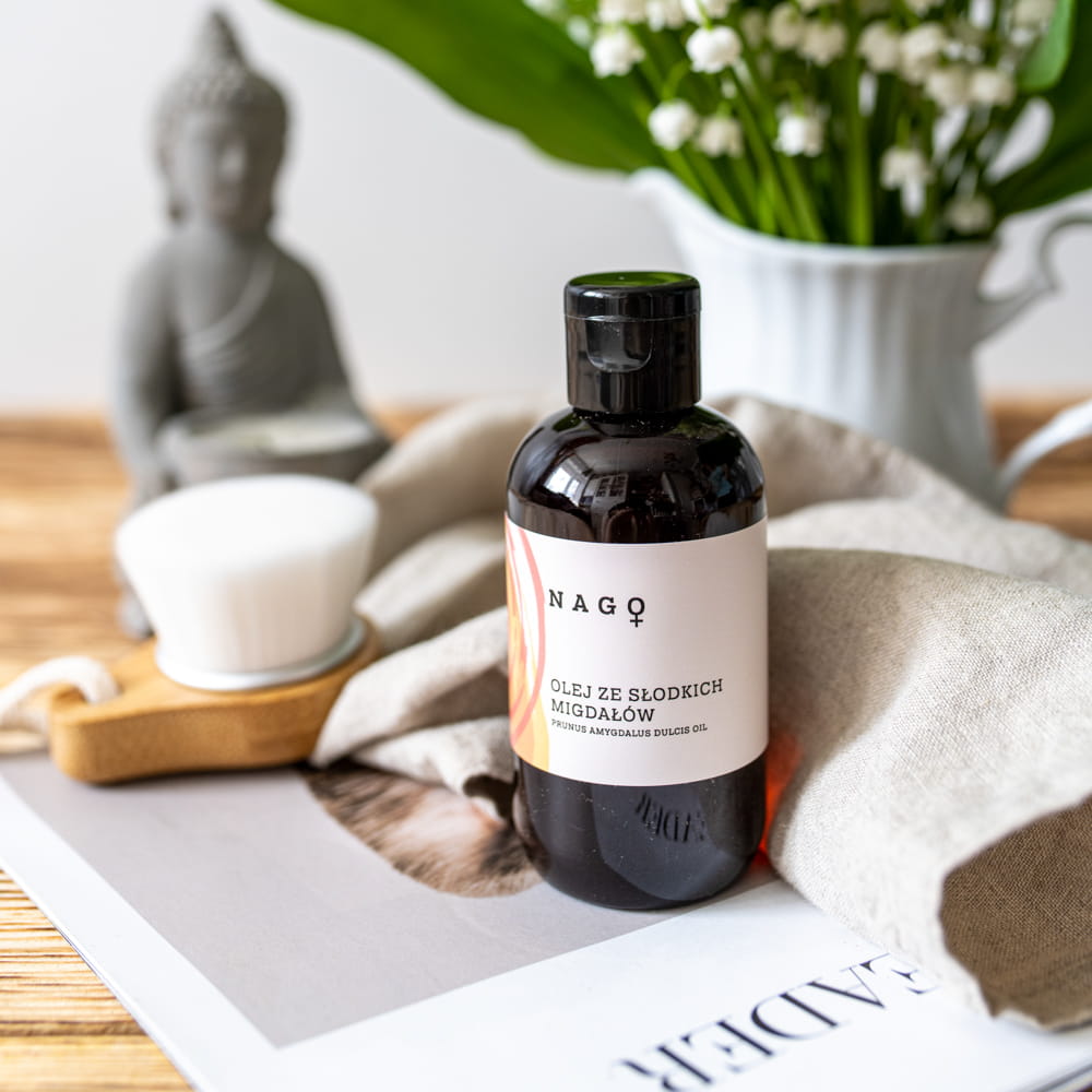 3. Lekki i nietłusty. Olej migdałowy, nałożony cienką warstwą, szybko się wchłania, pozostawiając skórę miękką, bez efektu tłustości, co sprawia, że jest idealny do codziennego stosowania.