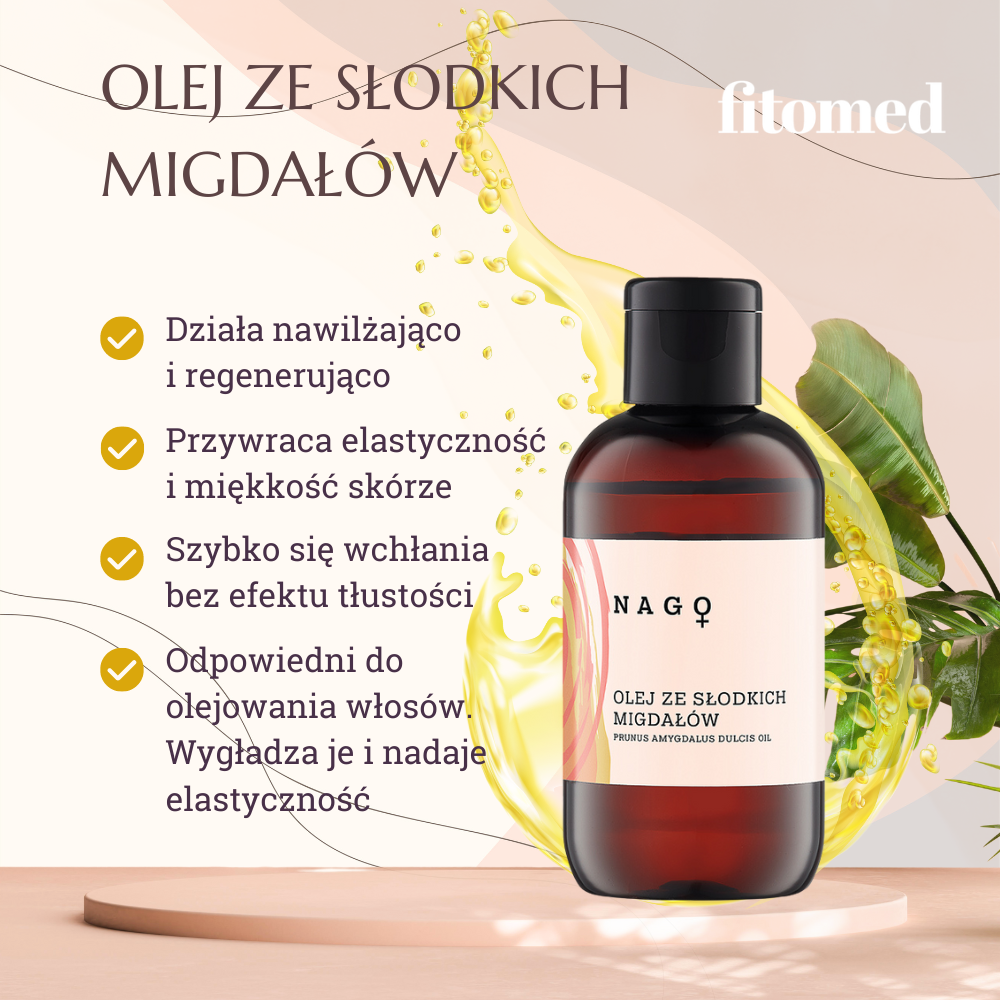 Olej ze słodkich migdałów (90 g) należy do najbardziej popularnych olejów kosmetycznych. Zawiera głównie kwas olejowy i NNKT. Stosuje się go w oczyszczaniu i pielęgnacji cery podrażnionej, wrażliwej i dojrzalej. Olej nie jest zbyt tłusty, jest lekki i dobrze współdziała z innymi surowcami kosmetycznymi.