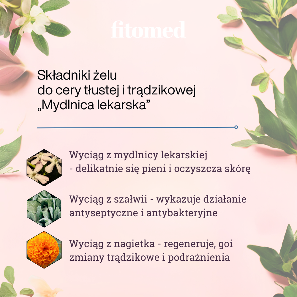 XXL Żel do cery tłustej „Mydlnica lekarska” (500 g) jest idealnym kosmetykiem dla osób z cerą tłustą, trądzikową i wrażliwą. Nie tylko łagodnie myje i oczyszcza skórę, ale również działa antybakteryjnie i zapobiega przetłuszczaniu się skóry. Wyciąg z korzenia mydlnicy lekarskiej jest bogaty w naturalne saponiny, co sprawia, że kosmetyk delikatnie pieni się pielęgnując Twoją skórę. Ekstrakt z liści szałwii jest silnym antyseptykiem, odblokowuje i delikatnie ściąga pory, zaś ekstrakt z nagietka łagodzi podrażnienia i regeneruje naskórek. Wybierając żel ziołowy do cery tłustej Fitomed zapewniasz skuteczną pielęgnację i ukojenie swojej skórze.